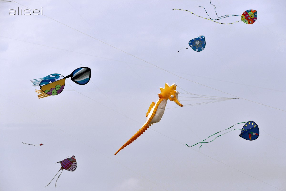 Nel campo di gara, grazie ad un vento non sostenuto ma sufficiente, si sono esibiti in successione tantissimi appassionati e professionisti che hanno fatto volare aquiloni di ogni genere e dalle forme più svariate, da quelli più classici a forma geometrica a quelli di notevoli dimensioni a forma di puffi, di cavallucci marini o di enormi coccarde fino a quelli enormi e sicuramente difficili da realizzare e difficili da governare con poco vento come il polipo giallo visibile nelle foto di questo articolo. Non sono mancati gli aquiloni acrobatici che hanno dato spettacolo, alcuni di questi realizzati come un insieme di piccoli aquiloni.
