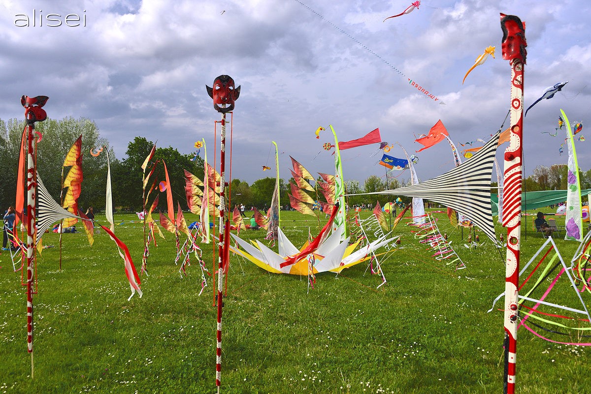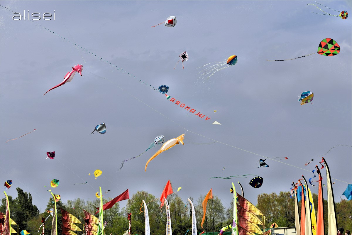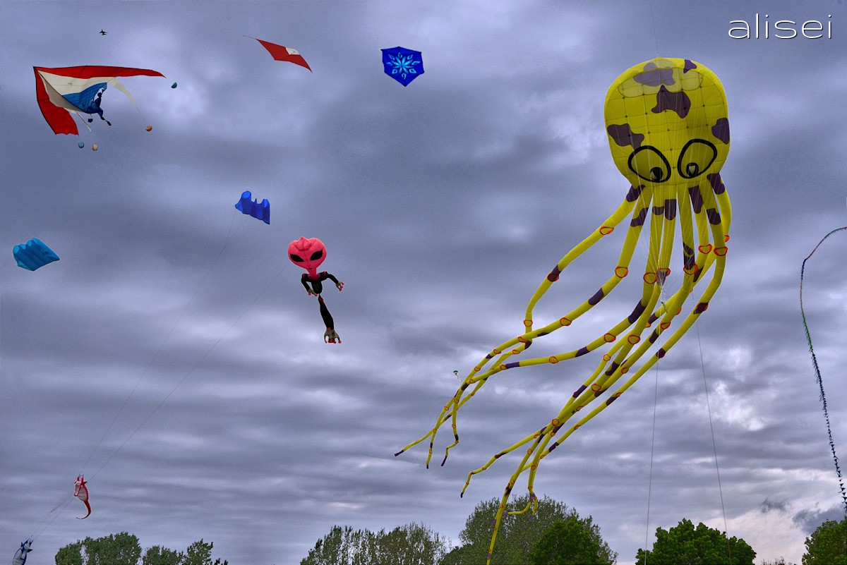 La manifestazione si svolge verso la fine del mese di aprile e per alcuni giorni e/o week-end occupa una parte del grande Parco Bassani di Ferrara in cui amanti e professionisti di questo genere, provenienti da molti paesi, si esibiscono per il pubblico e per il proprio piacere. Purtroppo la giornata in cui ero presente alla manifestazione non è stata delle migliori dal punto di vista meteorologico, ad una iniziale variabilità è seguita una copertura totale del cielo togliendo parte del fascino e dei colori che gli aquiloni sono in grado di esprimere. Le foto scattate risentono di questo ma spero diano comunque l’idea della bellezza dell’evento