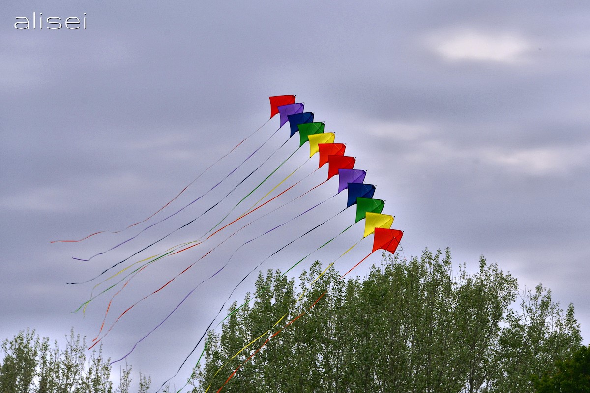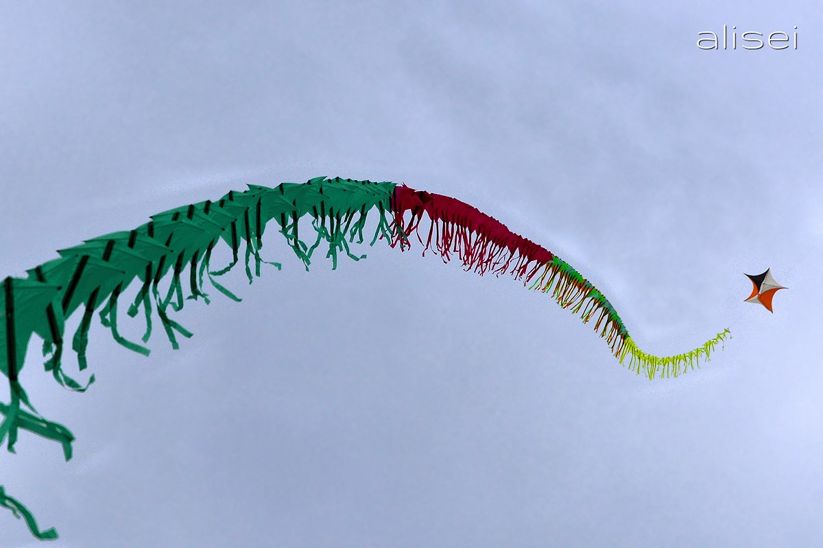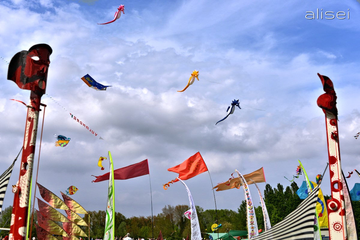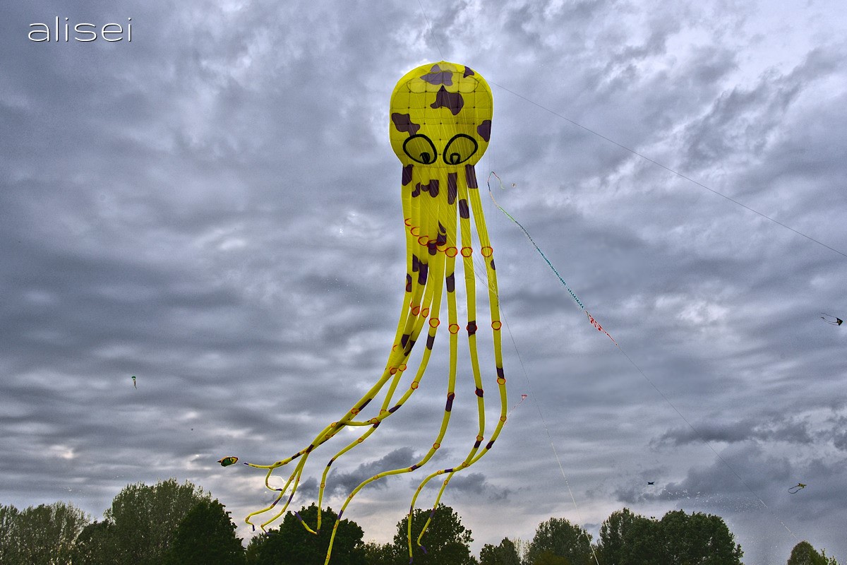 La manifestazione si svolge verso la fine del mese di aprile e per alcuni giorni e/o week-end occupa una parte del grande Parco Bassani di Ferrara in cui amanti e professionisti di questo genere, provenienti da molti paesi, si esibiscono per il pubblico e per il proprio piacere. Purtroppo la giornata in cui ero presente alla manifestazione non è stata delle migliori dal punto di vista meteorologico, ad una iniziale variabilità è seguita una copertura totale del cielo togliendo parte del fascino e dei colori che gli aquiloni sono in grado di esprimere. Le foto scattate risentono di questo ma spero diano comunque l’idea della bellezza dell’evento