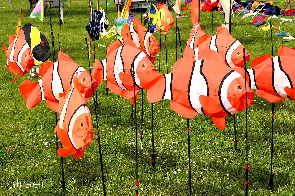 Nella zona degli aquiloni statici emerge l’inventiva di questi appassionati, aquiloni di ogni genere come gruppi di pesci pagliaccio disegnati in modo da muoversi con il vento come quelli veri, oppure ciclisti che pedalano vorticosamente sotto l’azione del vento che agisce sulle ruote appositamente disegnate come mulini a vento, insomma un insieme di oggetti che si muovo in mondo autonomo sfruttando anche una minima presenza di vento.