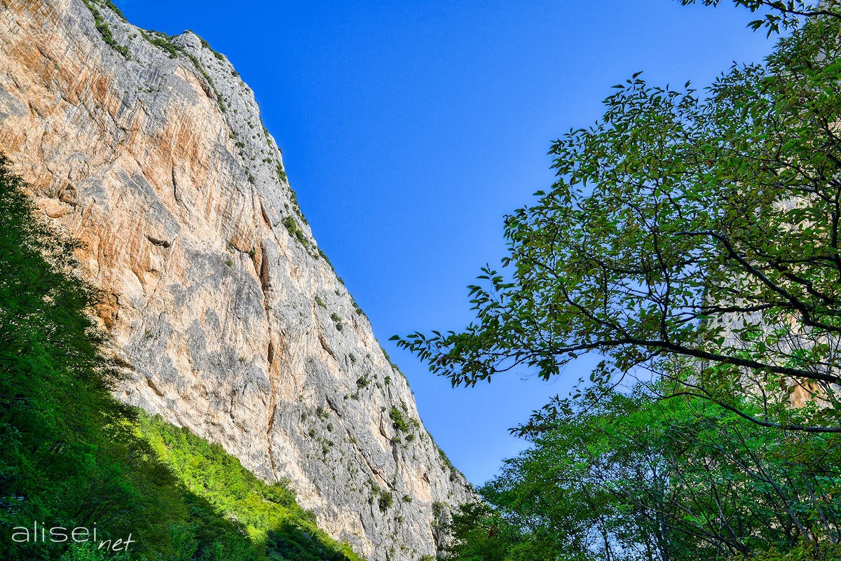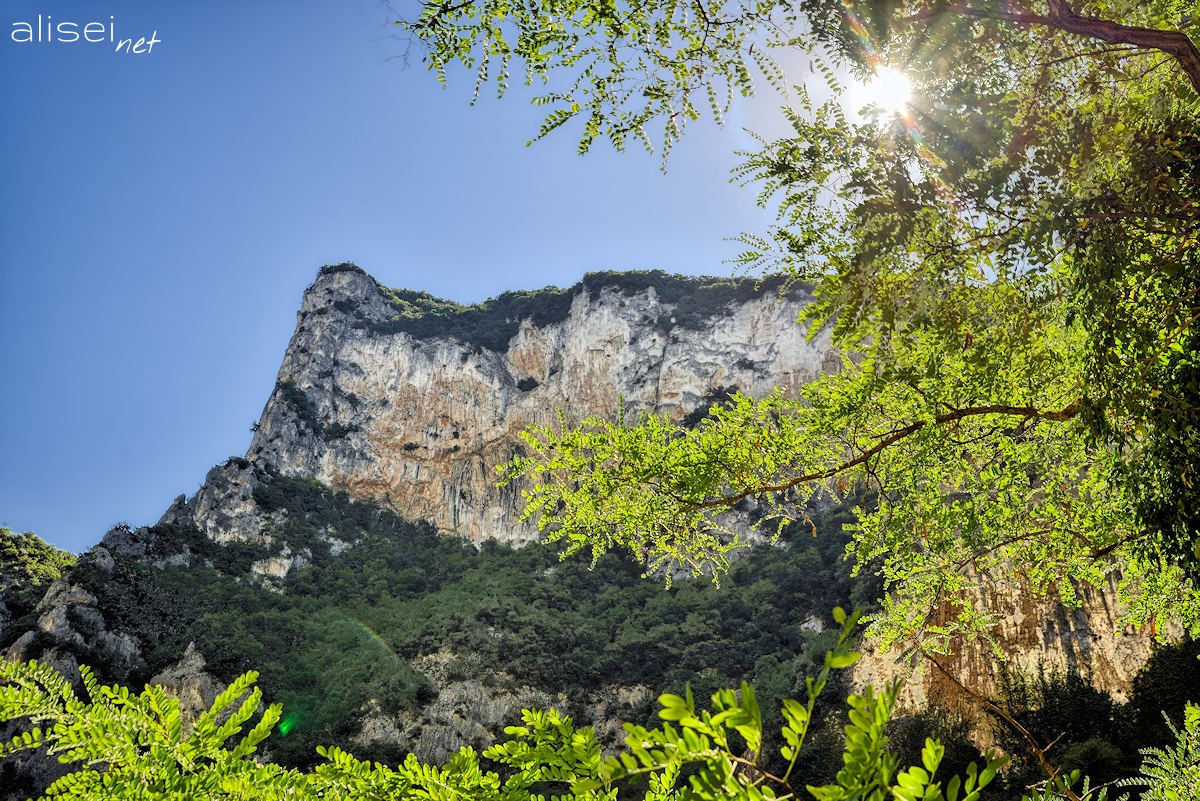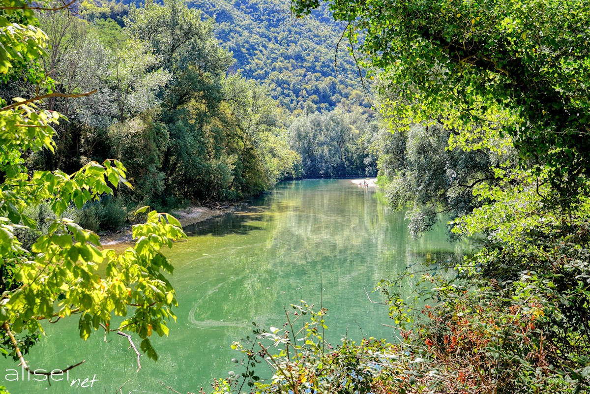 Siamo ormai entrati nella gola in uno dei punti più spettacolari dove subito appare una alta falesia, un’alta parete rocciosa verticale che domina la scena. Di fronte a tanta imponenza ci si sente piccoli piccoli. Il fiume si vede appena, coperto dalla folta vegetazione che qui cresce in abbondanza. L’acqua si muove lentamente a causa della diga e questo ha favorito lo sviluppo di alghe sul fondo del fiume rendendo il colore dell’acqua di un verde deciso e marcato. In piena estate qui si gode di molta ombra e di una piacevole temperatura che associata all’assenza di pendenze rende tutto piacevole.