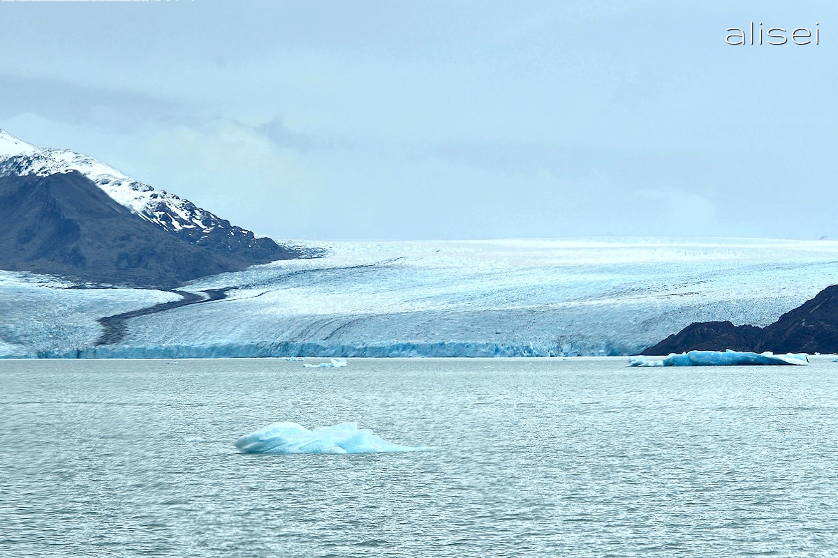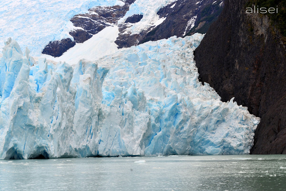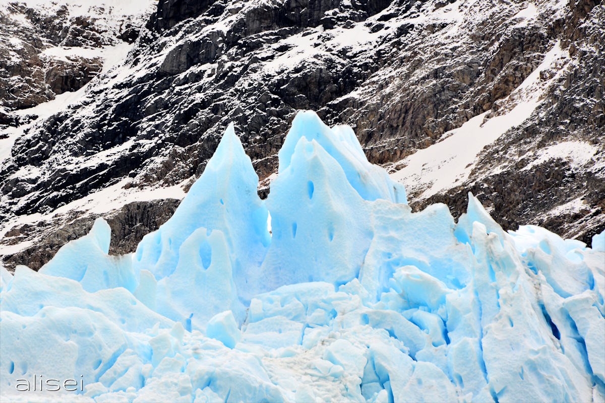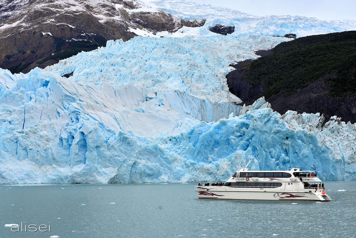 Anche durante questa navigazione incontriamo iceberg isolati che abbinati al paesaggio circostante creano scenari bellissimi e da cartolina. Ed eccoci giunti di fronte al ghiacciaio Spegazzini che pur essendo più piccolo rispetto all’Upsala fa comunque impressione. Anche qui, una volta avvicinati, si apprezza lo strato superiore costituito da punte e frammenti di ghiaccio, sicuramente taglienti più di una lama d’acciaio, anche qui le fratture nel ghiaccio sembrano illuminate dall’interno di una intensa luce blu. La motonave si muove lentamente dando i due lati (tribordo e babordo) al ghiacciaio in modo che tutti possano ammirare questa bellezza che sviluppa il suo fronte all’estremità dell’insenatura.